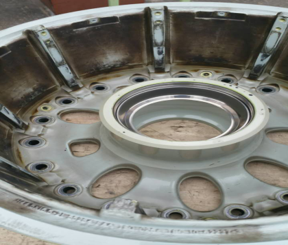 ![]() 需要翻新處理的飛機(jī)輪轂外形尺寸:Φ450-700*H140-400mm (看看,才幾天的飛行,飛機(jī)起降對(duì)輪胎、輪轂的沖擊有多大!) 噴砂后接受探傷檢測(cè)時(shí)的輪轂,讓損傷一覽無余!