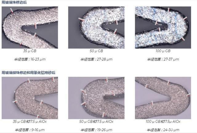經(jīng)過吉川公司工藝工程師測試,用氧化鋁砂進行定向的噴砂處理可以去除氧化層,平滑表面缺陷并改善外圍支架的表面質(zhì)量。支架的受損區(qū)域很脆,但基礎(chǔ)材料鎳鈦諾卻具有延展性。氧化鋁噴砂磨料使用去氧化層,并且對韌性基體的侵蝕最小,從而在支架撐桿的整個長度上形成均勻的表面光潔度。 市場最新的支架設(shè)計和醫(yī)療植入物要求更大的邊緣倒圓角。圓形邊緣降低了被植入物卡住,其他風險的可能性。氧化鋁微噴丸的半徑為5-15 m,但新的幾何尺寸指定為接近25 m。該半徑可以通過三種途徑實現(xiàn):延長噴砂周期,使用更大尺寸的氧化鋁或完全使用其他磨料。通過測試,我們了解到更長的噴砂周期可以去除更多的團塊,而較大尺寸的氧化鋁會產(chǎn)生過于粗糙而無法拋光的表面。畢竟,氧化鋁顆粒的形狀為塊狀,邊緣稍尖。這給了我們一個可行的選擇:嘗試使用其他類型的磨料。為了克服這一障礙,我們測試了幾種類型的介質(zhì),發(fā)現(xiàn)用玻璃珠噴砂可以在拐角處形成所需的半徑(最大30 m),而不會除去設(shè)備的額外質(zhì)量。結(jié)果是氧化鋁的質(zhì)量提高了十倍。經(jīng)過吉川公司工藝工程師的測試事實說明了結(jié)果的差異。用氧化鋁噴砂處理過的樣品的半徑僅為8-13 m,而用玻璃珠噴砂處理過的樣品的半徑為24-30 m。 經(jīng)過吉川公司工藝工程師最終測試事實證明,最好的心臟支架噴砂工藝需要用氧化鋁砂粗噴砂、再用玻璃珠微噴砂是目前最好的一種噴砂工藝方式。 經(jīng)過粗噴、微噴的產(chǎn)品外徑和內(nèi)徑轉(zhuǎn)角處的半徑可以實現(xiàn),而所需的附加材料去除最少。半徑的大小可以有效地控制,因為它是基于圓形磨料,玻璃珠的大小和速度的??梢钥刂凭哂懈郊影霃降闹Ъ軈^(qū)域。通過機械加工表面,有助于保持支架的疲勞壽命。玻璃珠磨料通常用于必須保持嚴格公差的噴丸處理應(yīng)用中。玻璃珠對支架表面進行噴丸處理,不會去除任何材料或數(shù)量可忽略不計的材料。如下所示,玻璃珠的尺寸很重要。玻璃珠的尺寸越大;邊緣越圓。玻璃珠有35 ,50 和100 兩種。讓我們看一下使用每種尺寸的樣本測試的結(jié)果。此處顯示的未噴砂的支架表面(500x)邊緣鋒利,并受到制造損壞。半徑范圍僅為3-8 m。為什么用兩種磨料處理比單獨用氧化鋁處理好? 玻璃珠無法消除制造過程中產(chǎn)生的浮渣,回彈和其他損壞;只有氧化鋁可以。氧化鋁不能產(chǎn)生真正的圓形邊緣。但是,它確實可以提供電拋光所需的理想表面光潔度。一個不能替代另一個。通過使用多步驟過程,植入物表面可以使用經(jīng)過驗證的相同設(shè)備獲得兩全其美的效果。在該過程中添加第二種研磨劑聽起來可能需要更多的勞動力,但實際上比其他修邊過程更有效。例如,電拋光可以產(chǎn)生較大的半徑,但它也會從整個零件中去除過多的材料,而不僅僅是角部,從而損害了支架的疲勞壽命。
