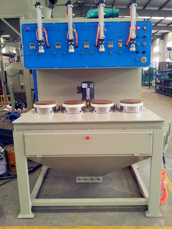 一、 設(shè)備組成: a)?? :主機(jī) i.????? 主機(jī)由小轉(zhuǎn)盤轉(zhuǎn)動機(jī)構(gòu)、噴槍擺動機(jī)構(gòu)、噴砂室、操縱系統(tǒng)、儀表箱等組成,電機(jī)均采用臺灣臺邦牌。室體由3mm冷軋鋼板焊接而成,內(nèi)外表面噴漆,外形尺寸: 1350X1250X1950(mm)。 ii.????? 4支噴砂槍分4組全部固定在軸上定點對工件噴砂;噴嘴材質(zhì):進(jìn)口碳化硼噴嘴。噴嘴通徑:Ф8mm。